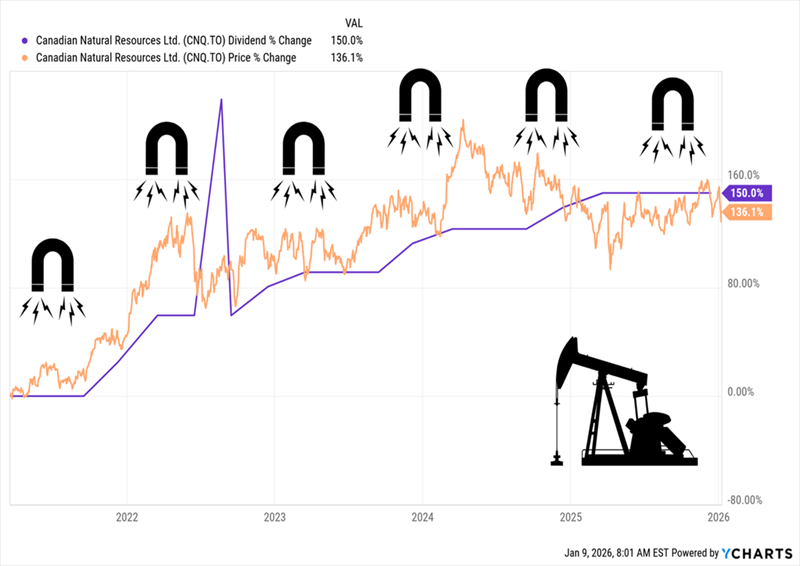 All of this opens the door to dividend hikes—which would act as a magnet on the share price. Check out how CNQ’s stock followed its dividend higher in the last five years.