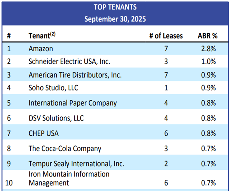 Its portfolio is tuned to the automation and “reshoring” trends washing across manufacturing, too. Look at its top-10 tenants (with, importantly, none making up more than 2.8% of yearly base rent).