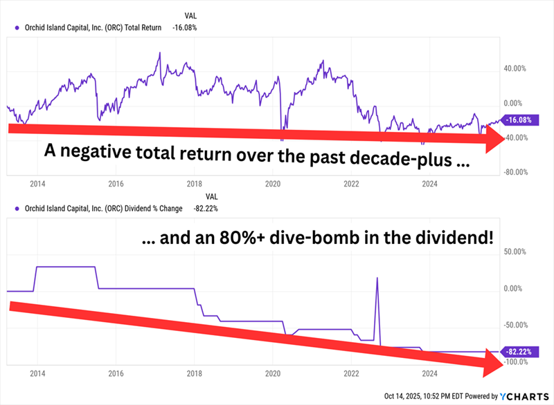Orchid Island’s long-term total return since its 2013 initial public offering is bad enough. But the massive dividend papers over a trainwreck of a price performance, with shares off 90% since that IPO. The declines have been so precipitous that just a few years ago, ORC had to initiate a 1-for-5 reverse stock split; without it, shares today would trade for less than $2.