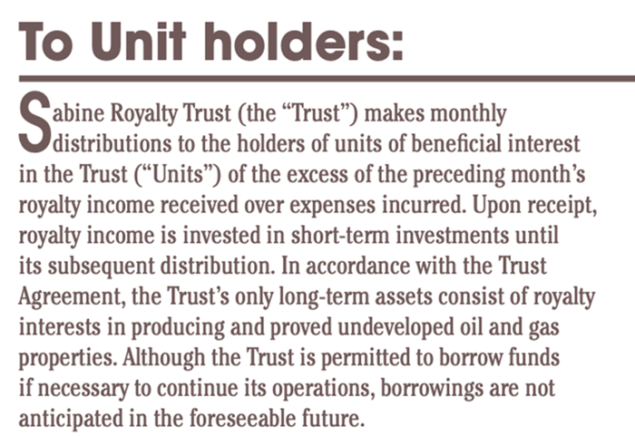 How central are distributions to royalty trusts’ existence? Here’s the first paragraph from the first page of SBR’s most recent earnings report: