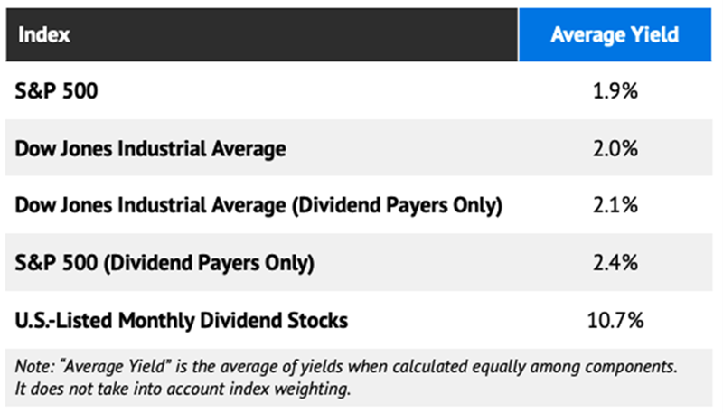 If we randomly select a few monthly dividend payers, chances are we’ll earn (way!) more. Here’s the difference between the stock market’s monthly dividend stocks and the major indices: