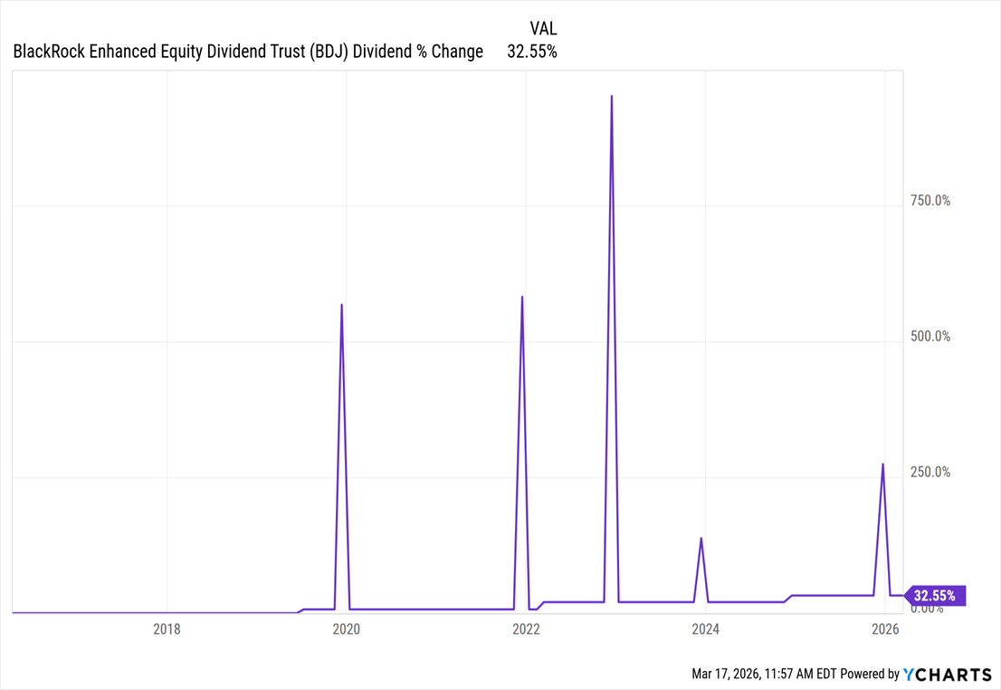 But notice the long-term trend of continually increasing payouts. Moreover, periods of higher market volatility make BDJ more profitable because the fund sells call options on its portfolio, and this strategy does well in choppy markets. As a result, BDJ has more income to pass over to shareholders.