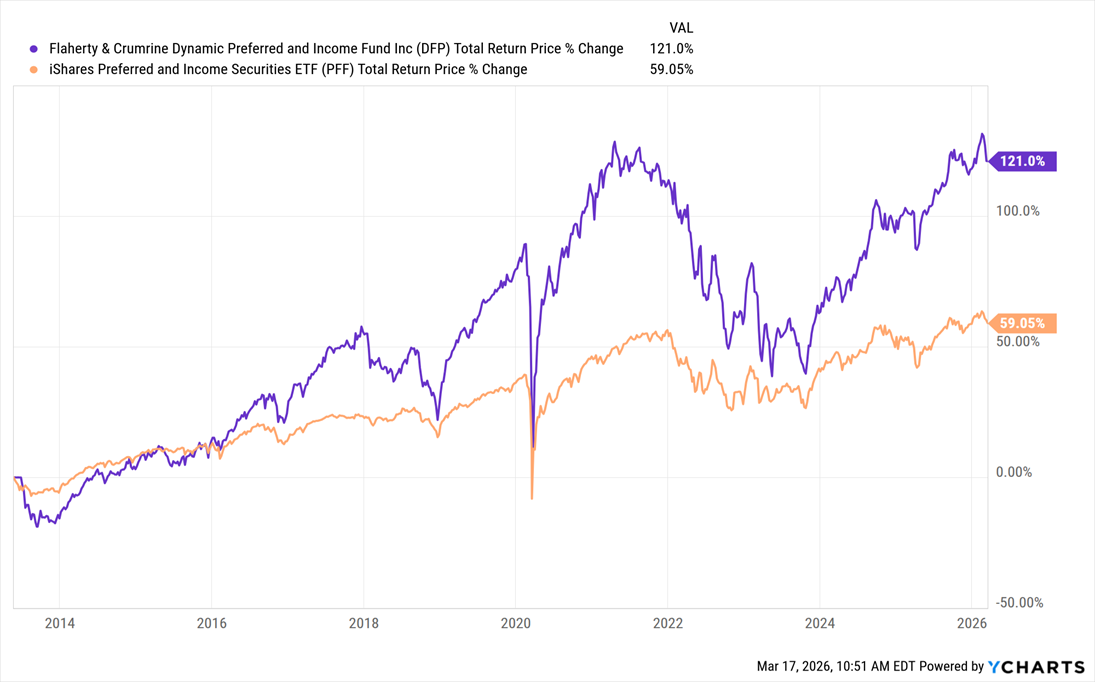 The Flaherty & Crumrine Dynamic Preferred and Income Fund (DFP) is managed by one of the savviest companies in the CEF game: Flaherty & Crumrine. Not only are they top-notch financial minds, but they also pay a healthy 7.3% dividend to DFP shareholders. And they’ve handily beaten their index, in this case represented by the iShares Preferred and Income Securities ETF (PFF), since its IPO.