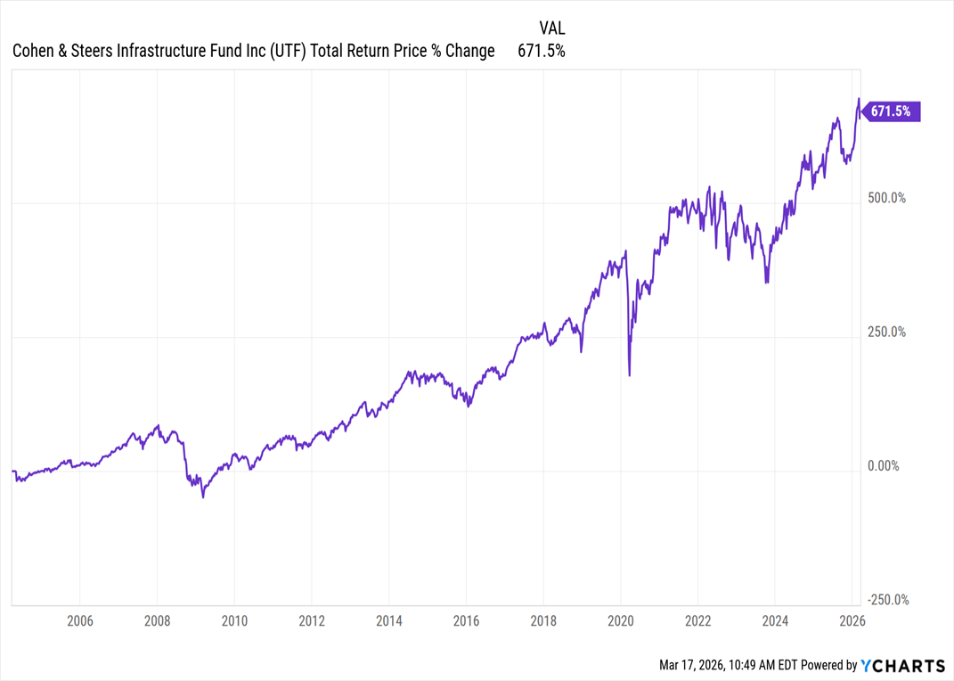 The Cohen & Steers Infrastructure Fund (UTF) is a CEF that yields 7.2% and specializes in shares of utilities. You may know of utilities as a “widows and orphans” sector—a sleepy group of companies that yield a lot but return a little over the long term. Yet UTF has delivered well over a 600% return since inception, as of this writing.