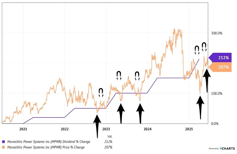The reason for the bargain was the stock’s powerful “dividend magnet,” the safest and surest way to get rich in stocks. Over time, stock prices always follow their payouts (for better or for worse!). So, we love stocks like MPWR because we can’t help but make money!