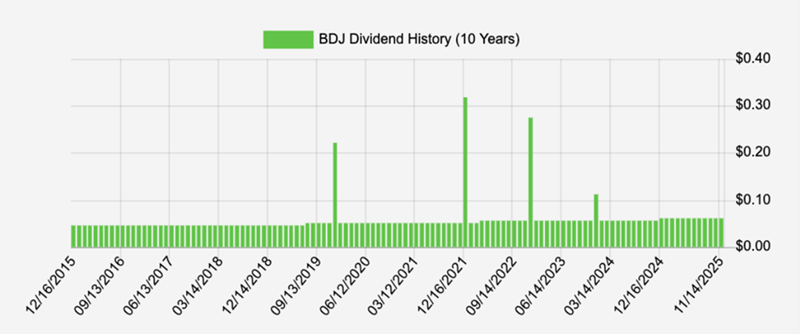 Let’s start with BDJ’s dividend, which is not only hefty but has risen a stout 33% in the last decade (not including special dividends, which BDJ has paid four times in that span):