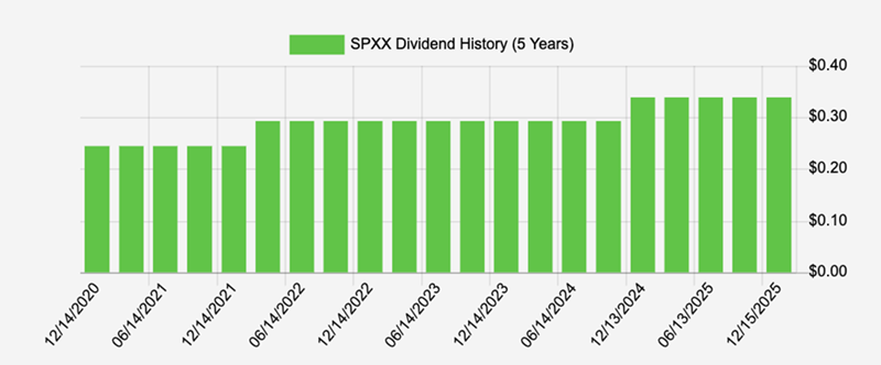 SPXX has posted a total return of 10% in the past year (in purple below). Yes, that’s a few points behind the S&P 500, but that’s normal for a covered-call fund, as their strongest stocks are sold, or “called away,” under their options strategy.