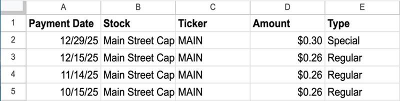 Let’s take a look at Main Street Capital (MAIN). We love MAIN because it pays monthly and it dishes extra “special” dividends. Great for our wallets, but terrible for a spreadsheet!