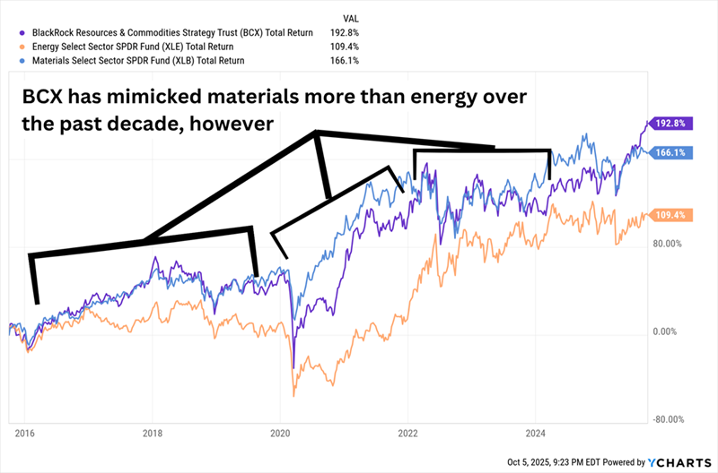 But CEFs like the BlackRock Resources & Commodities Strategy Trust (BCX) aren’t afraid to “cross the streams.”