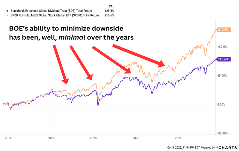 BlackRock Enhanced Global Dividend Trust (BOE) is like a mix of ETV and EVT, with global exposure (read: U.S. and international stocks) mixed in.