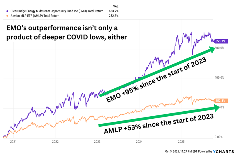 EMO trails its benchmark, the Alerian MLP Index—represented in the chart below by the Alerian MLP ETF (AMLP)—by 30 percentage points since inception in 2011. But since 2023 EMO has nearly doubled the return of AMLP, thanks to its aggressive leverage.