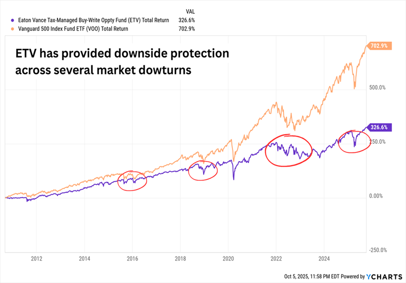 The latter is the case with the Eaton Vance Tax-Managed Buy-Write Opportunities (ETV). It holds a portfolio of 150, mostly large-cap stocks like Nvidia (NVDA), Microsoft (MSFT) and Apple (AAPL), then sells covered calls on a few major market indexes like the S&P 500 and Nasdaq Composite to generate income, which it distributes to its shareholders monthly.