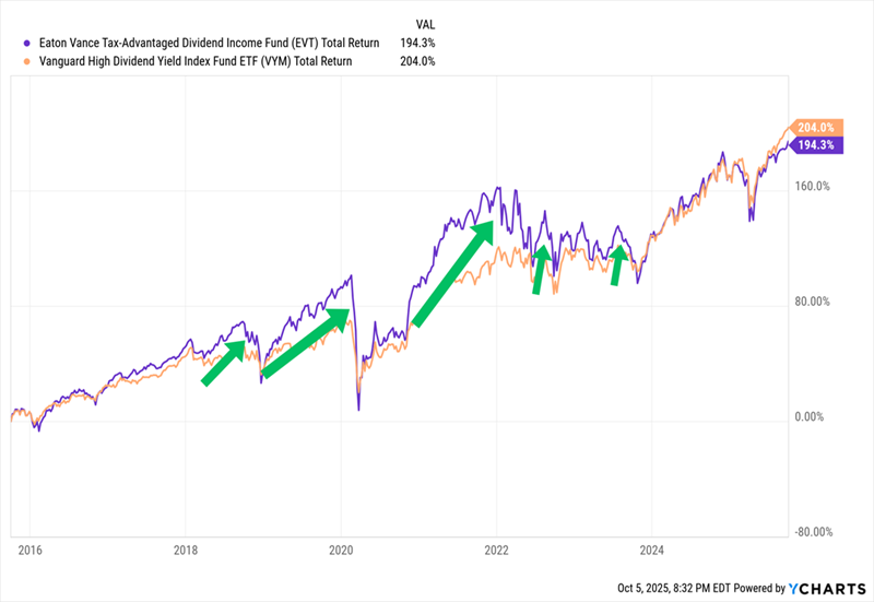 But while that fund would likely pay 2% or so, EVT delivers 4x that number, at 8% currently. (And it’s a monthly dividend payer, no less.)
