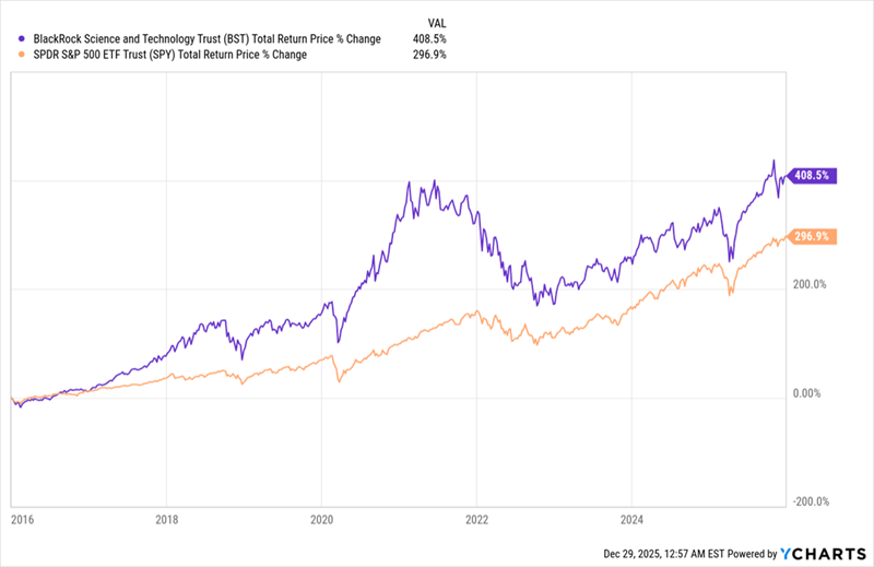 Check this chart out—the S&P 500, with less tech exposure than BST, has crushed BST over the last decade! BST is clearly a dud, then, right?