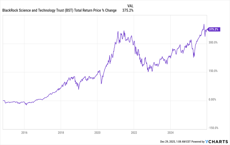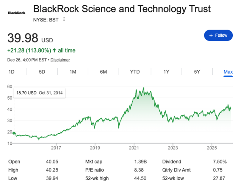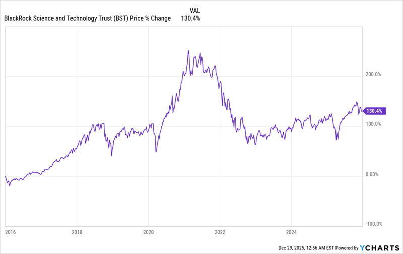 The fund I’m talking about is the BlackRock Science and Technology Trust (BST), a CEF that holds many of the major tech stocks, including Apple (AAPL), Microsoft (MSFT) and NVIDIA (NVDA). So you’d expect it to have strong long-term returns, on top of its 7.5% dividend. Let’s look at how it’s done over the last decade.