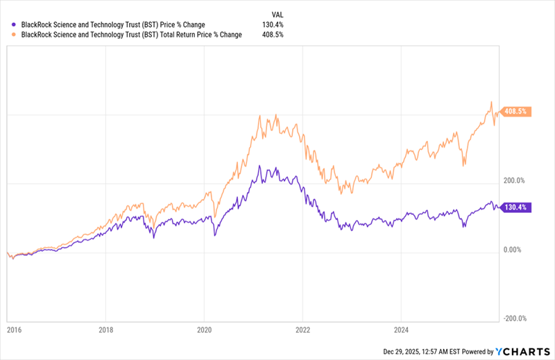 The above chart shows two numbers: The purple line is the one you’ve already seen, showing BST’s 130.4% price gain (remember that phrase for a second) over the last decade. The orange line, however, shows a 408.5% total return for the fund. That’s obviously much higher.