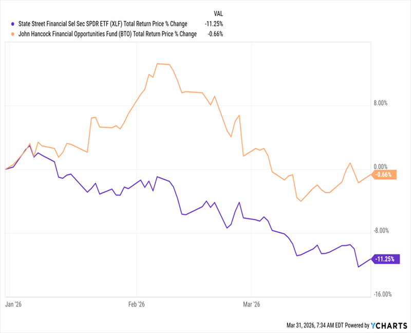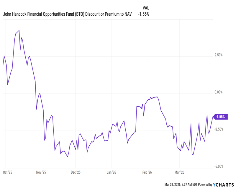 That would be the John Hancock Financial Opportunities Fund (BTO), which yields 7.7% today and, as we’ll see, trades at a discount that’s double what most investors think it is.