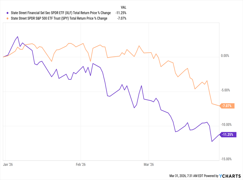 Fast-forward to this year, and finance stocks are being hit harder in the Iran War fallout, falling much further than the market since the start of the year.