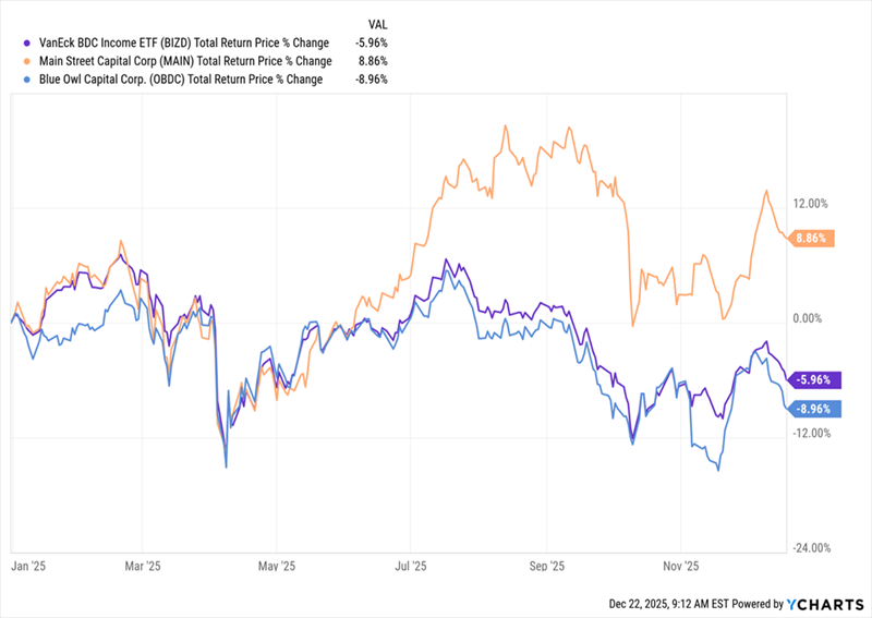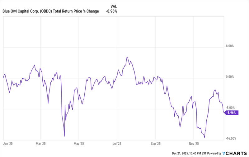 All of these factors can drag on performance. Consider, for example, Blue Owl Capital Corporation (OBDC), which has $6 billion in assets and attracts a lot of attention with its 11.7% yield. That’s been cold comfort for investors, since OBDC has dropped 9% this year, even with dividends included.