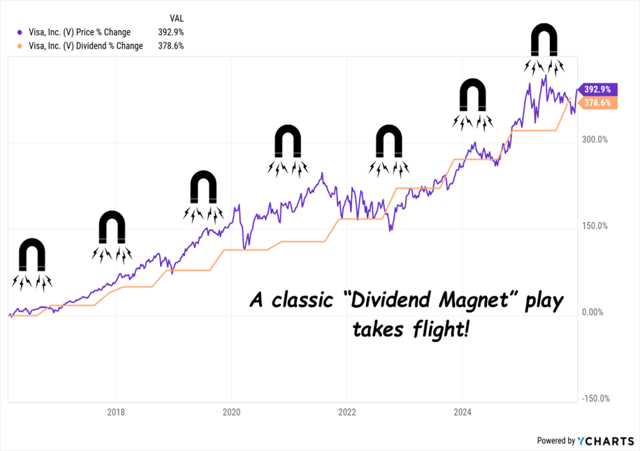 Brett Owens here. I just wanted to say thank you for joining Contrarian Income Report. You’ve made a great decision: you’re joining thousands of investors who are pocketing steady yields of 11.1%, 11.7% and even 14.9%. (I’m not pulling those yields out of thin air; they’re real yields from our portfolio as I write this—and many of these payouts roll into your account monthly.) With yields like that, you can generate a liveable income stream in retirement on dividends alone, without ever having to touch your principal! The latest issue, full Contrarian Income Report portfolio and your special reports are all waiting for you now. But before you dive into them, there’s something else I want to tell you about. It’s my most powerful tool for delivering the two things we ALL crave: a soaring dividend and strong price gains, too. Both are key to building our savings and staying ahead of the cost of living, especially with the elevated inflation we’re still dealing with. What I’m about to reveal is the perfect companion for the huge cash payouts you get from Contrarian Income Report. I only make it available to new Contrarian Income Report members. And you’ll ONLY be able to get it now. It’s a very special “add-on” to your new CIR membership: a risk-free 60-day trial to Contrarian Income Report’s sister publication, Hidden Yields! But this exclusive offer is only available on this page, right now. Once you click through, your opportunity will be gone—and it won’t come again. Many new CIR members take this opportunity to “kick the tires” on Hidden Yields without hesitation. It’s a no-brainer if you want to add double-digit yearly dividend growth and a shot at big share-price gains to your income portfolio. And who doesn’t? You and I both know that any price gains you collect in the part of your portfolio you look to for income are a bonus. Pure gravy. The key to this upside isn’t speculation—no profitless tech stocks, tough-to-value SPACs or, heaven forbid, meme stocks here. We’re targeting well-established companies sitting on boatloads of cash—and handing it out to investors like us in the form of fast-growing dividend payouts. Because here’s something almost everyone forgets: where dividends go, share prices soon follow. It’s as sure as night follows day! Just look the king of all payment processors, Visa (V), which we’re holding in our Hidden Yields advisory’s portfolio now. There’s a good reason why: Even though the company’s current yield is less than 1%, its payout has skyrocketed, up an eye-popping 379% in the last decade. That powerful “Dividend Magnet” has driven an incredible 393% rise in the share price over the same period!