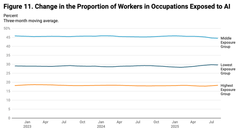 This chart comes from a recent Yale study showing that the share of workers exposed to AI hasn’t changed since the tech was released. “If AI were automating jobs at scale, we would expect to see a smaller share of workers in some of the jobs that are most negatively impacted,” the authors wrote. Yet this chart shows no change at all.