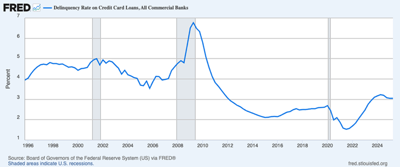 This chart, for example, tells us that over the last year, Americans have been less delinquent on their credit cards than they were a year ago, and the overall percentage is pretty small—now about 3.1%, much lower than it was in the 1990s and 2000s.