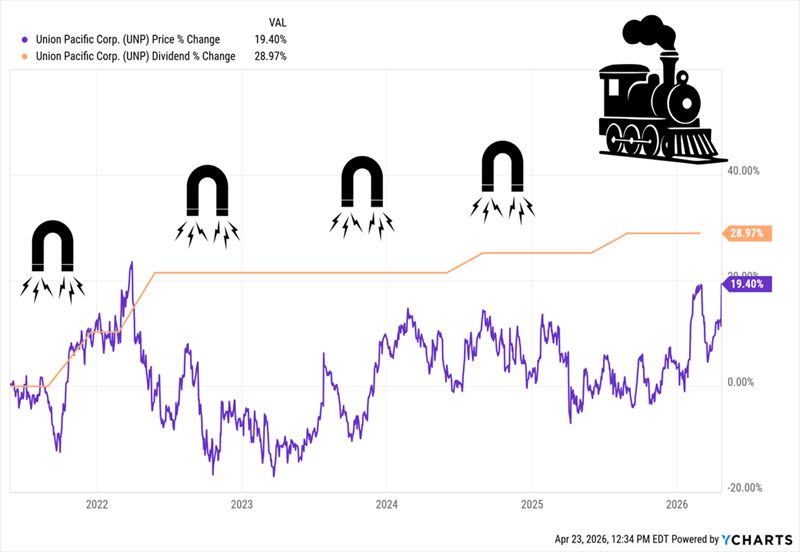 Moreover, in the last five years, UNP’s share price has fallen behind its dividend. That sets it up for “snap-back” gains—especially as management has restarted dividend hikes: