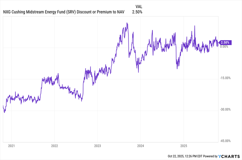 Let’s wrap by adding energy stocks through the NXG Cushing Midstream Energy Fund (SRV). Its 12.8% yield is the biggest of our trio, but its pricing chart is different.