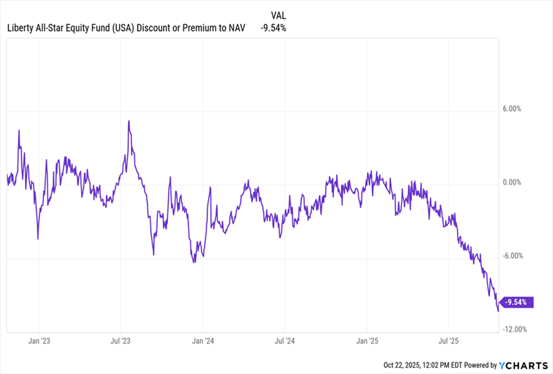 This return is more than enough to cover the fund’s dividend, which yields 11.3% annualized. That return should be rewarded with a premium valuation, yet USA not only trades at a discount, but its discount has widened, creating a rare buying opportunity.