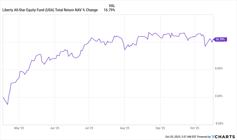 Now let’s add stocks through the Liberty All-Star Equity Fund (USA), a CEF holding well-known firms like AI stars NVIDIA (NVDA), Microsoft (MSFT) and Amazon.com (AMZN).
