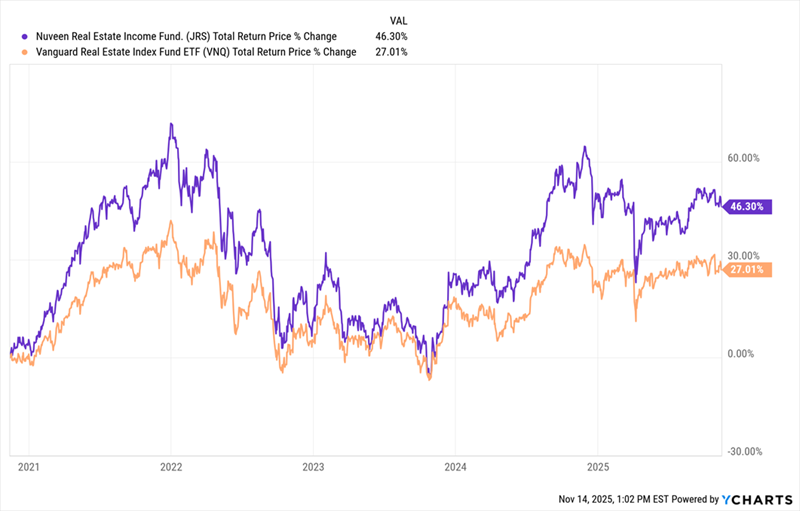 This buying opportunity exists even though JRS crushed the benchmark REIT ETF, the Vanguard Real Estate ETF (VNQ), in the last five years, something many pundits will tell you an actively managed fund simply isn’t supposed to do.