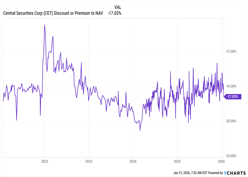 A CEF like the Central Securities Corporation (CET) is a good example. It trades at a 17% discount (so for 83 cents on the dollar, in other words!) while focusing on high-quality public firms with big margins and strong cash flows: Alphabet (GOOGL), Progressive Corp. (PGR) and Amazon.com (AMZN) are its top stock positions.