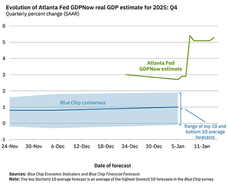 As of now, it’s pointing to an incredible 5% gain in GDP in the last quarter of 2025. That’s far ahead of the roughly 1% growth most economists are calling for.