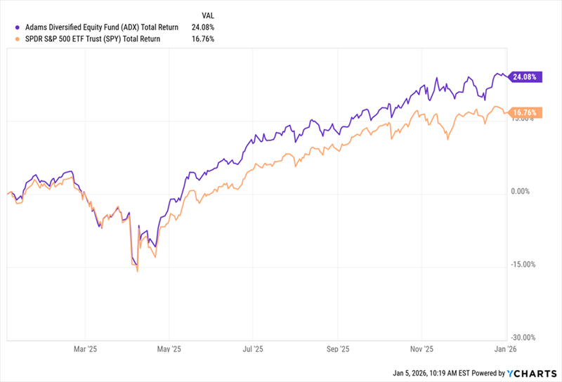 In this market, while we wait for AI to continue its spread through the US economy, getting a big slice of our return in cash dividends is key. That’s why we prefer a closed-end fund (CEF) like the Adams Diversified Equity Fund (ADX), a long-time holding of my CEF Insider service.