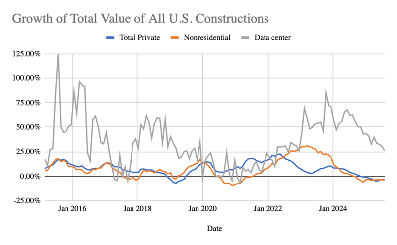 But what about all the infrastructure investments we hear about, especially around data centers? One report says we saw about a 30% growth rate in data-center spending in the middle of 2025, to about $40 billion on an annualized basis, and the Fed estimates about $41.2 billion. But both sources also cite rapid growth in building back in 2023 and 2024, so the 2025 rate actually moderated compared to 2024.