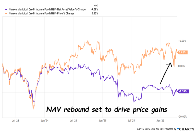 Another thing to note here is the inverse relationship between NZF’s NAV and interest rates: When rates jump, NZF’s NAV falls (and vice versa). That overall trend toward higher rates cut the fund’s discount to NAV from roughly 14% when we bought to around par today.