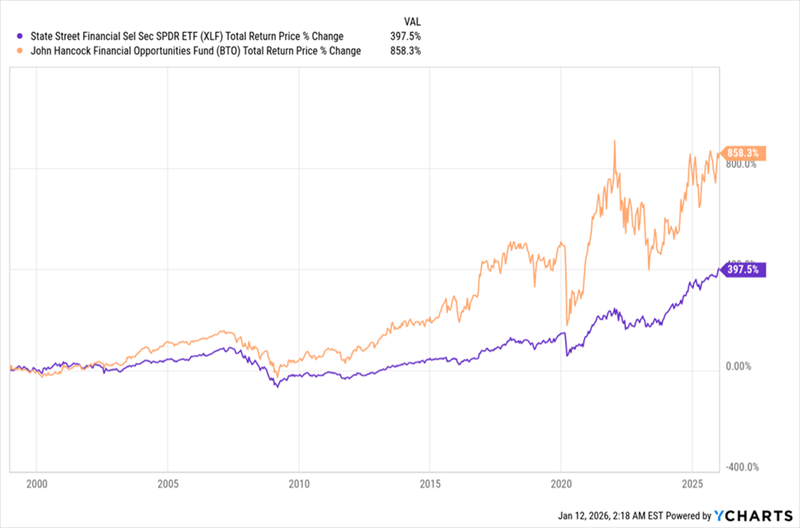 BTO has returned over 800% since the late 1990s, when XLF went through its IPO, while XLF has delivered less than half that. And even though BTO and XLF give you exposure to the same sector and face similar risks, BTO delivers five times the income and has returned more than double the profits.