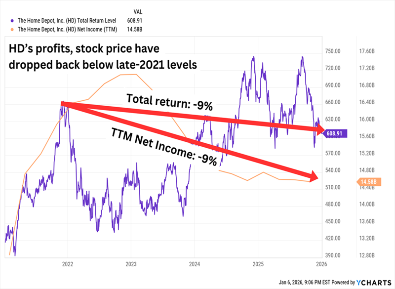 The Skinny: Home Depot (HD, 2.7% yield) is another new Dog for 2026 following an up-and-down 2025 that ultimately resulted in a nearly 10% loss for shareholders. Tariffs are partially to blame here, as are generally more cautious consumers. But we can also point the finger at a stagnant housing market (and an uncertain outlook) that’s keeping a lot of buyers on the sidelines.