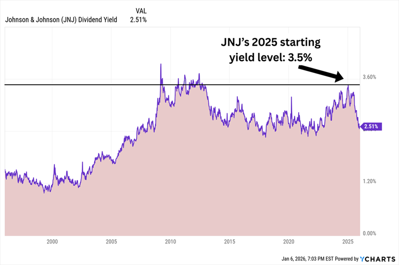 The Skinny: In 2025, Johnson & Johnson (JNJ, 2.5% yield to start 2026) gave us a prime example of what we want out of our Dividend Dogs. Those who jumped on the pharma company’s shares locked in a yield that was well above JNJ’s historical averages, then the stock rocketed to the mean and a 47% total return.