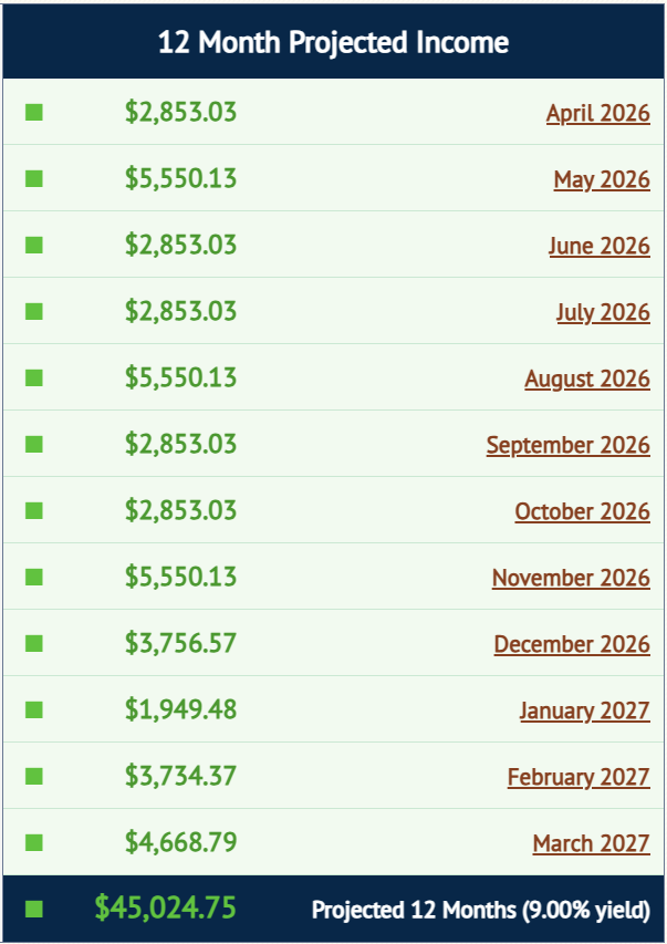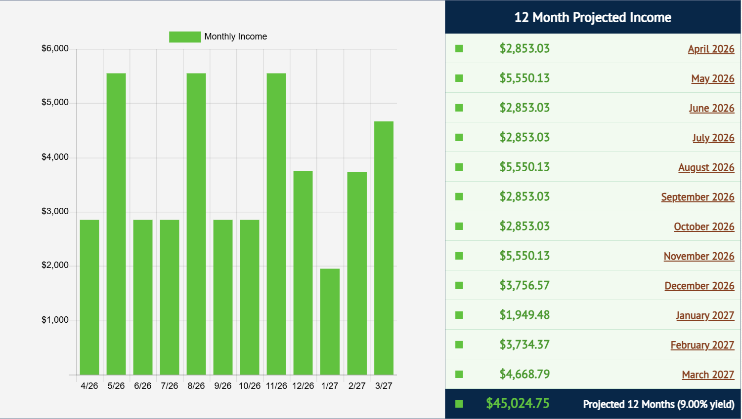 And—here’s the cool part—see how MAIN’s dividend fits within the context of my overall income for the next 12 months. Instead of a spreadsheet or an AI text-dump, I get a clear, visual road map of my cash flow: