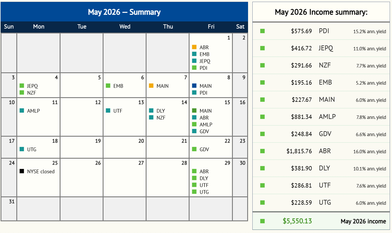 MAIN pays us monthly, but other tickers in our portfolio “only” pay quarterly. Income Calendar stitches it all together into one view: