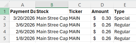 Let’s take a look at Main Street Capital (MAIN). We love MAIN because it pays monthly and it dishes extra “special” dividends. Great for our wallets, but terrible for a spreadsheet!