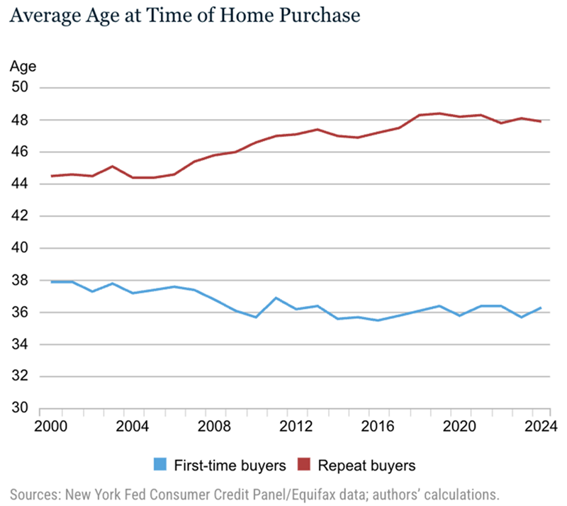 Now, things aren’t perfect. You can see that even the Fed data shows the average age of the American repeat homebuyer is up from 44 in the early 2000s to 48 in 2024. But bear in mind that the average American is four years older now than in 2000.