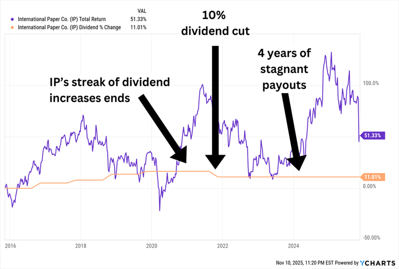 IP has suffered similar issues to Sonoco—namely, higher input costs, softer demand, and tariffs. Continued economic uncertainty also doesn’t bode well for the company’s near-term prospects.