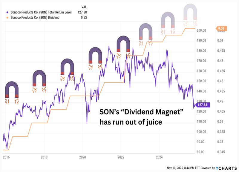 Sonoco Products (SON) is a packaging dinosaur turned value play. This 126-year-old firm is cheap at 6.5-times earnings, has a 42-year raise streak rolling and is still unloved after a messy Eviosys deal ruffled Wall Street’s feathers.