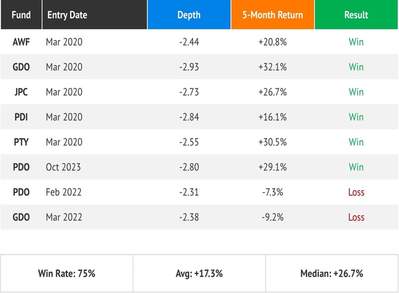 A 75% batting average is excellent. The eight buys averaged +17.3% over five months—and that includes two small losses from the 2022 rate-hike cycle dragging the number down. That’s over 46% annualized. Not bad returns from “boring” bond funds!