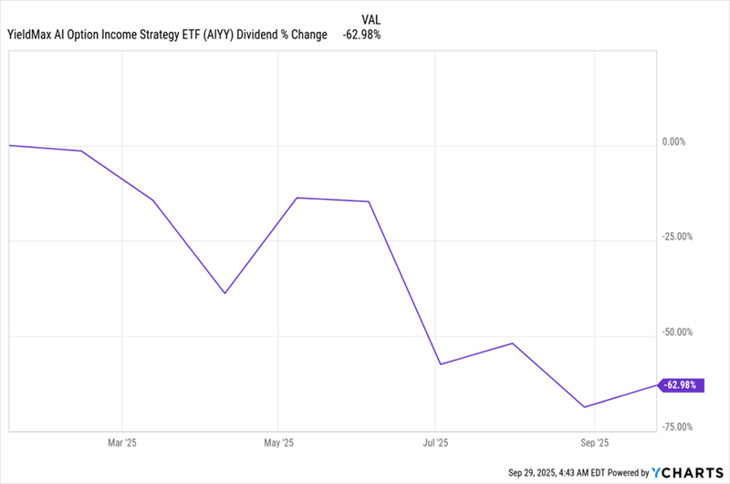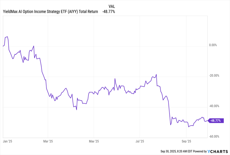 Consider the YieldMax AI Option Income Strategy ETF (AIYY), which aims to deliver that 70% income stream by holding C3.ai (AI), a developer of AI apps for business. As I write this, AIYY investors have seen a total return of nearly negative 50% since the start of the year.