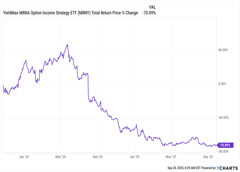 Sure, the income is great when the stock is rising, but that income will shrink if the stock drops. That’s what happened to the 56.2%-yielding YieldMax MRNA Option Income Strategy ETF (MRNY), which holds Moderna (MRNA) and is down 39% in 2025 and down even more since its IPO in early 2024.