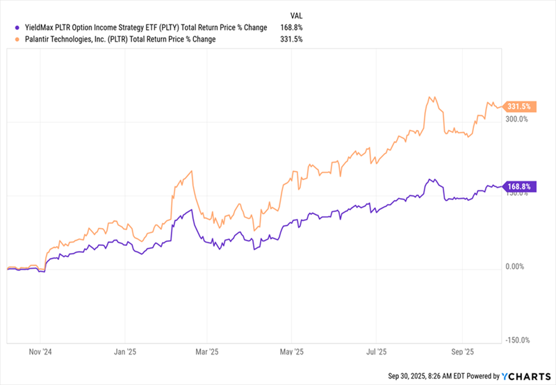 As you probably guessed from the fund name, this ETF tracks Palantir, whose stock has surged as the company wins more government contracts. If you predicted PLTR’s surge, congratulations—that’s impressive. But an investor who knew to invest in PLTR should’ve just bought that stock instead, since PLTY (in purple below) has badly lagged it.