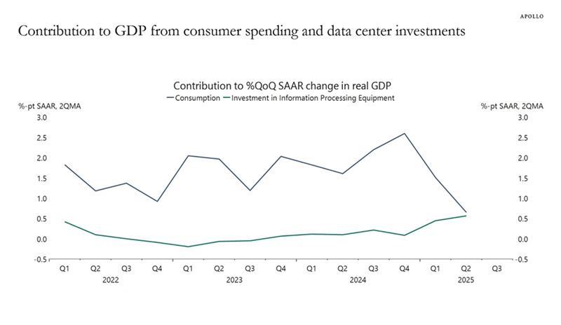 It’s easy to see what’s catching investors’ attention on the data center front: Investment in AI’s computing backbone is on track to contribute more to US economic growth than the American consumer.